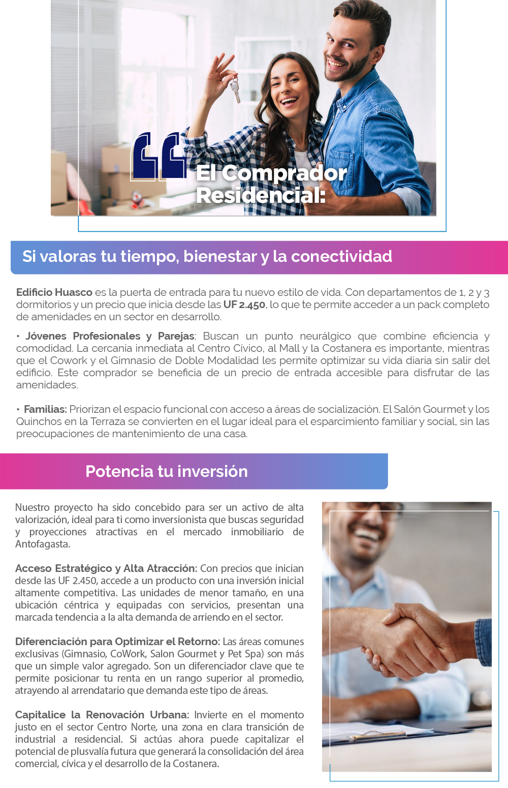 | En la transformación urbana del sector Centro Norte de Antofagasta, ubicado específicamente en calle Huasco esquina Iquique, una zona identificada con un potencial inmobiliario importante. El proyecto combina un diseño arquitectónico moderno, con una ubicación estratégica y de alta plusvalía. |